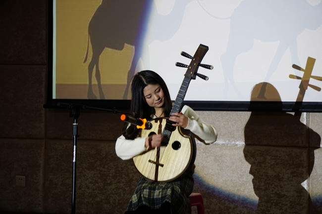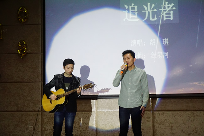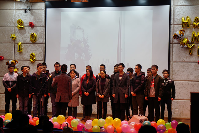 开场舞《我的青春叫周杰伦》为双旦晚会拉开了帷幕。歌曲、乐器类节目交替进行,精彩纷呈:1702班全体同学合唱了一曲饱含家国情怀和爱国热忱的《国家》,1702班谭涵带来了一首古朴淡雅又跌宕起伏的中阮独奏《丝路驼铃》,16级博士金荣河、1605班胡琪和1706班叶柳君分别带来了三首唯美动人、抒情悦耳的吉他弹唱《追光者》、《Secret Base》和《南方姑娘》。1706班吴伟、戴心野带来的粤语歌曲《红日》和1701班李佳妮带来的英文歌曲《Impossible》气氛热烈,将整场晚会推向高潮。1701班张弛、1705班许睿分别带来歌曲《谢谢侬》、《化身孤岛的鲸》,前者曲风轻快,后者宛转悠扬。晚会语言类节目诙谐幽默、笑点满满:由1706班带来的小品《监考老师》和1704班带来的三句半《研究生活瞎扯淡》都从研究生学习、生活出发,生动活泼地演绎出了研究生生活中的酸甜苦辣;本科生代表带来的小品《后宫那些事》,声情并茂地展现了妃子的爆笑争宠之举,而最后“皇上”带领“妃子”们尬扭秧歌,引爆了整部剧的笑点。由SUP舞室的小Y、豆豆带来的舞蹈《Sorry Not Sorry》,惊艳全场,引得观众尖叫不断。褚丽丽老师和研会主席团成员带来了歌曲联唱《我们的歌》。