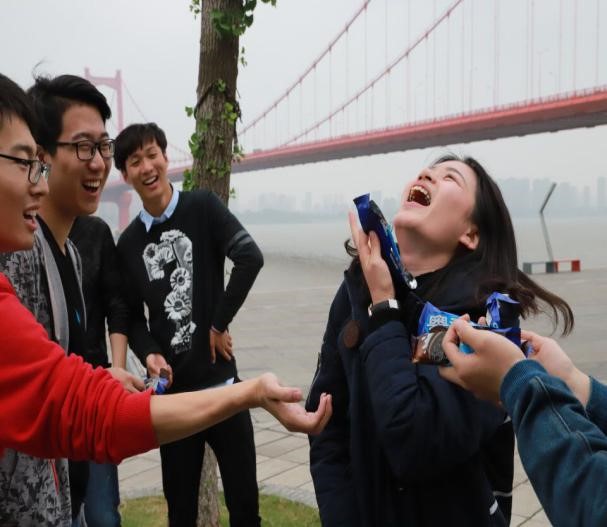 最让大家笑声不断的就是第三个游戏环节,将一块奥利奥饼干放在额头上,通过各种面目动作努力将饼干滑入口中,欣赏一下队员们夸张搞笑的面部表情吧!