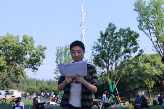 所有成员分为四组,历经四关,即“答题驿站、团队接力赛,你比我猜,谁是大歌王”。“答题驿站”关卡沿湖设三处驿站,各组在各处驿站答题闯关,题目涉及历史人文,地理时政,寓教于乐。第二关“团队接力赛”中,各组成员将脚共绑,并肩前行,默契在此中生起。第三关“你比我猜”,三人配合,凭肢体语言传递信息,增加成员间默契。高潮出现于“谁是大歌王”,大家的默契和热情在歌声中得到充分释放和升华,活动在热情洋溢的《我的祖国》歌声中落下帷幕。此时,东湖波漾,夕阳斜长。